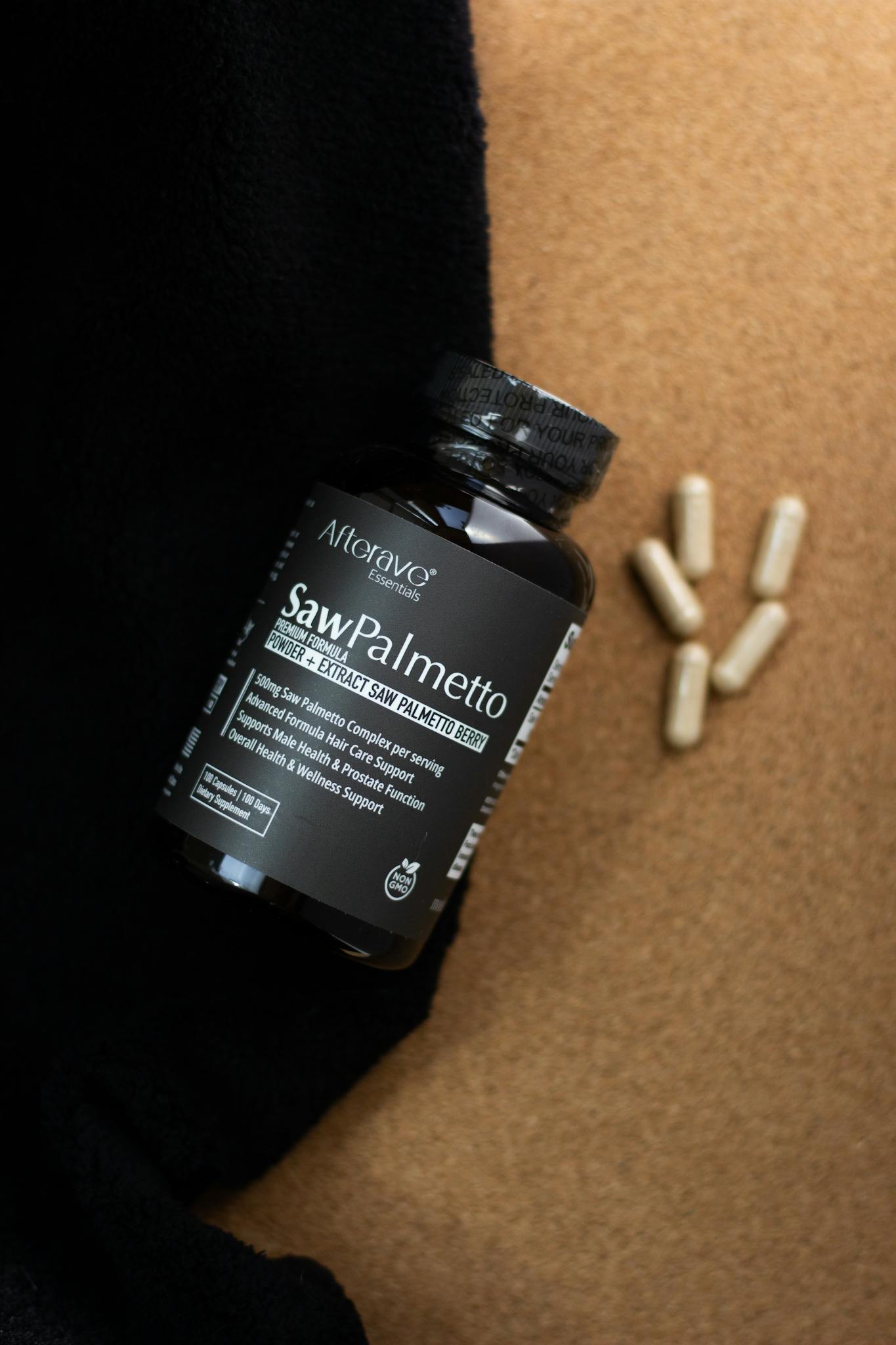 Three Saw Palmetto supplement bottles with capsules on a textured black surface.